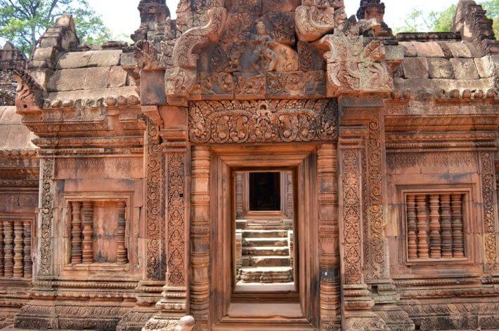 Prasat Banteay Srei – Eu particularmente adorei esse templo. Por estar fora do circuito há menos turistas. Este templo é o único no complexo construído por mulheres no final do século 10. Construído em arenito avermelhado e, embora seja um templo muito menor do que os outros, se destaca em Angkor. Há relevos e esculturas em suas paredes e é possível ver desenhos tridimensionais muito preservados.