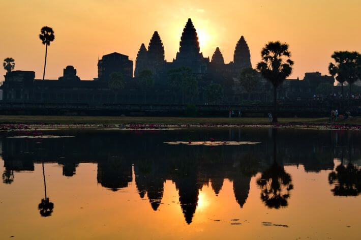 Antes de ir até o Angkor Wat, verifique o horário do nascer do sol, e chegue uns minutos antes. Não precisa chegar muito antes, uns 15 minutos está de bom tamanho. Haverá uma multidão esperando para ver o nascer do sol. Não se preocupe com a multidão, muitos estarão lá desde as 5 horas da manhã. Assim que a pontinha do sol aparece, muitos dos que aguardaram por horas ansiosamente, vão embora. Aproveite, pois a paisagem continua linda e você poderá ver o nascer do sol sem pressa e depois disso, tirar uma foto como essa.