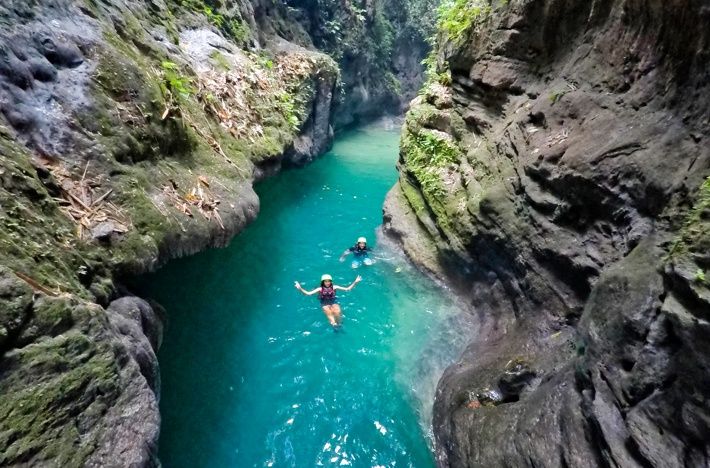 São as cachoeiras mais famosas das Filipinas. Mas o que mais atraí os turistas até lá é o Canyoning. Canyoning, é descer um canyon seguindo o curso da água. Então você acaba andando muito dentro da água, pulando em cachoeiras, e nadando. Tudo é feito com colete e você não precisa saber nadar. Foi uma das coisas mais legais que fizemos em toda a viagem.