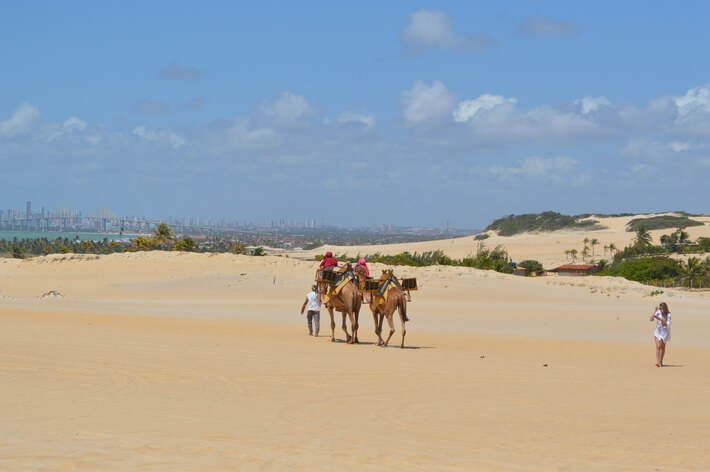 Passeio de dromedário nas dunas de Geripabu, com a cidade de Natal ao fundo